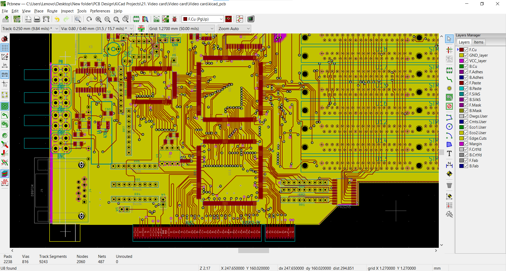 With the processing power requirements increasing nowadays, modern computer systems are in need of advanced graphics. To achieve this, separate video cards yield the best results. Given these facts we took the challenge, in cooperation with computer experts in the region to develop the best pcb design for a video card, which will be power efficient and of high performance.